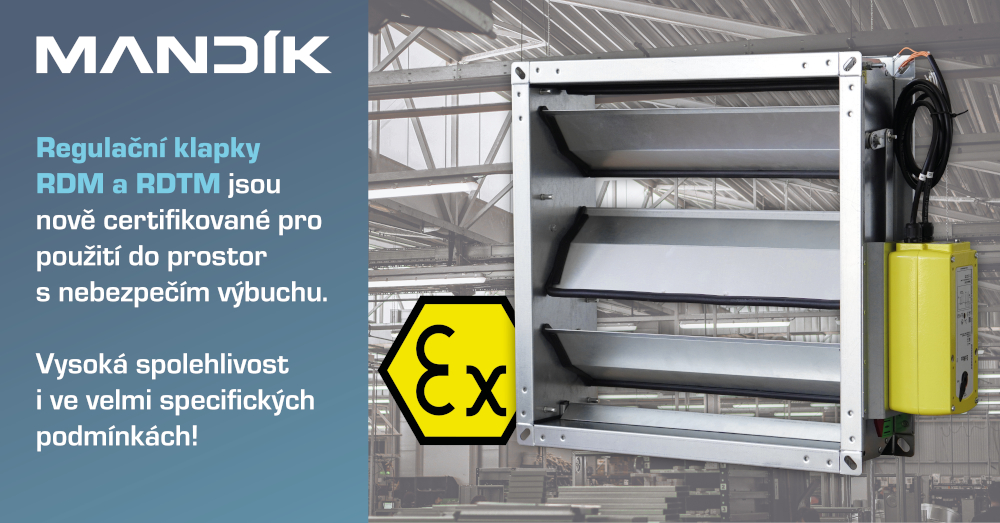 RDTM jsou nově certifikované pro použití v prostorách s nebezpečím výbuchu (Ex). Tato certifikace zaručuje, že naše klapky vám poskytnou spolehlivý výkon i ve velmi specifických a náročných podmínkách.