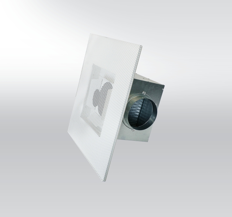DVCM – Perforated air diffuser for air supply or air exhaust, with excellent out-look when installing into suspended ceiling with square gypsum sound attenuating cassettes. Duct air inlet/exhaust on the plenum box can be installed from the site or from the top. Plenum box has option to be equipped with regulating flap and perforated air diffusing plate.