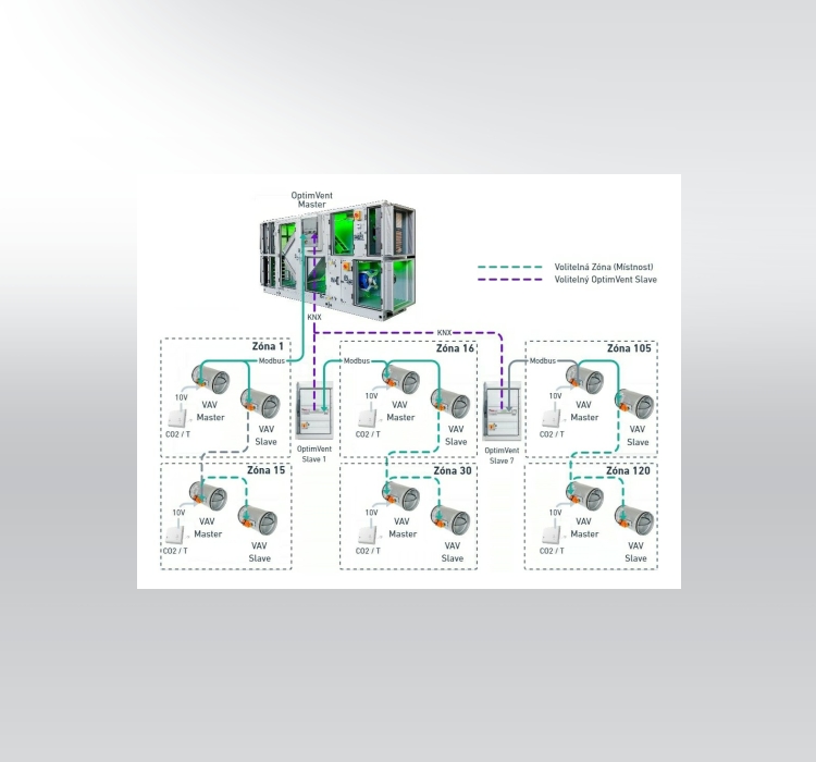 Energetickou optimalizaci výkonu ventilátorů lze zajistit s variabilními regulátory průtoku, kde se výkon ventilátorů řídí na základě údajů z regulátorů průtoku. U klimatizačních jednotek spolupracujících s variabilními regulátory průtoku je velký potenciál pro snížení spotřeby elektrické energie ventilátorů, tedy zásadní snížení finanční náročnosti provozu klimatizační jednotky. Automatická regulace otáček ventilátorů pracuje tak, aby bylo dosaženo optimálního poměru mezi množstvím dodaného vzduchu a spotřebovanou energií. Výsledkem je výrazné snížení tlakových ztrát na variabilních regulátorech průtoku a tím k energetickým úsporám dosahujícím desítek procent.